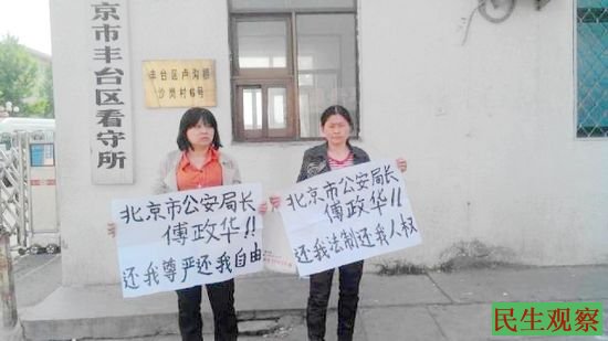 维权公民马胜芬和冉崇碧 在丰台看守所举牌讨说法 |