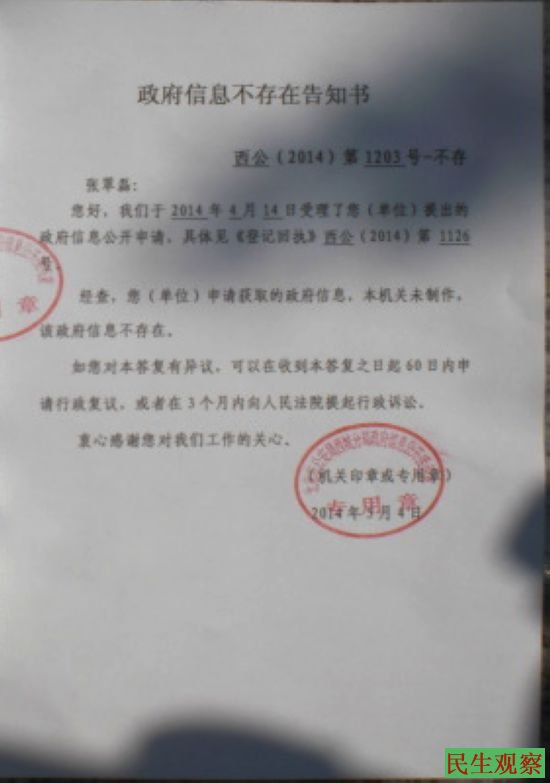 河北石家庄访民张翠磊申请信息公开后经过10天的等待,拿到了一份《政府信息不存在告知书》,告知书中称:该政府信息不存在,其他几位访民也同样拿到的是政府信息不存在的告知书。