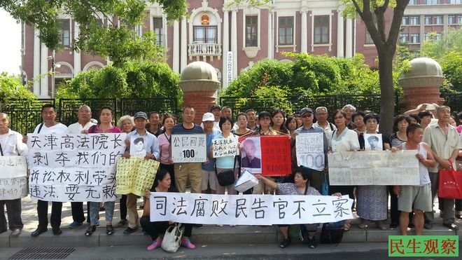 民生观察工作室2014-6-13消息:今天是天津访民每周五到天津市人大请愿的第100周,他们的请愿要求是:请求人大履行监督一府两院的职责,督促政府依法行政、督促法院对民告官给予立案,公正判决。但自2012年5月12日(周五)至今的100个周,始终没能得到天津市人大的回应。