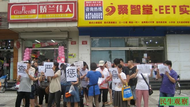 民生观察工作室2014-6-16消息:15日下午两点,数十位学生家长代表在北京海淀区蓝旗营聚智堂教育机构门前举牌抗议,抗议聚智堂教育机构单方面中止对上千名学生的教学课程。