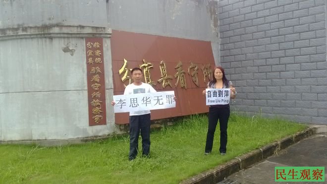 民生观察工作室2014-6-22消息:今天下午,维权人士刘沙沙、李宝霖、尹旭安、张玮珊继前几日围观刘萍三君子开庭,今天下午又来到新余市分宜县看守所(李思华,魏忠平关在那里)和分宜县政府前,打出标语对三人再进行声援,以下是现场图片: