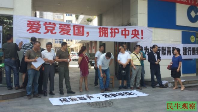“断友”们来到银行后,要求与行长对话并商讨解决方案,但银行工作人员却说行长们都在开会,没有时间接待维权者。为此,“断友”们开始拉出印有“爱党爱国,拥护中央!”、“我为建行献青春,建行毁我后半生!”的大型横幅,表达抗议。不久,银行的一位办公室主任出来接待了大家,但是,几经商议也未有任何结果。