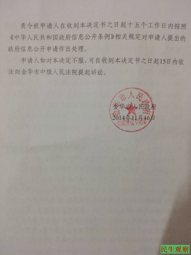 金华市人民政府于2014年11月16日作出决定,责令被申请人在收到决定书之日起十五个工作日内按照《中华人民共和国信息公开条理》相关规定对申请人提出的政府信息公开申请作出处理。