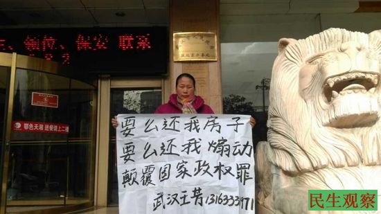 据悉,武汉公民王芳,原住房在武汉市武昌区的某社区内,某日她家的房屋遭遇强拆。无奈,她就租住到了武汉市洪山区的一座比较廉价的房屋内。随后,她又被武汉市洪山公安分局和辖区派出所多次驱赶她搬家未果。在2014年6月19日上午,王芳再被武汉当局强迫其立即搬家。