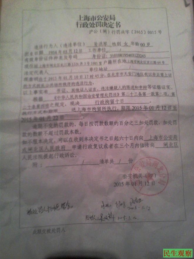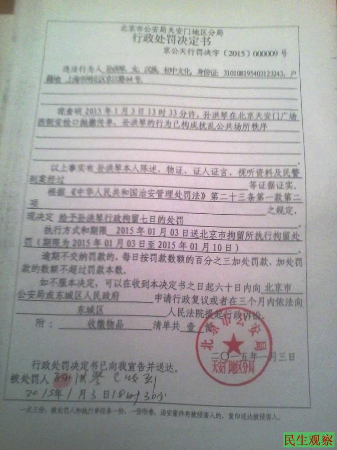 2015年1月3日,上海孙洪琴在北京天安门广场撒了喊“救命”的34张传单后,被北京警方行政拘留7天后放出。1月12日孙洪琴被接回到上海,上海闸北区芷江西路派出所再一次将她行政拘留十天。昨天下午她被期满释放。