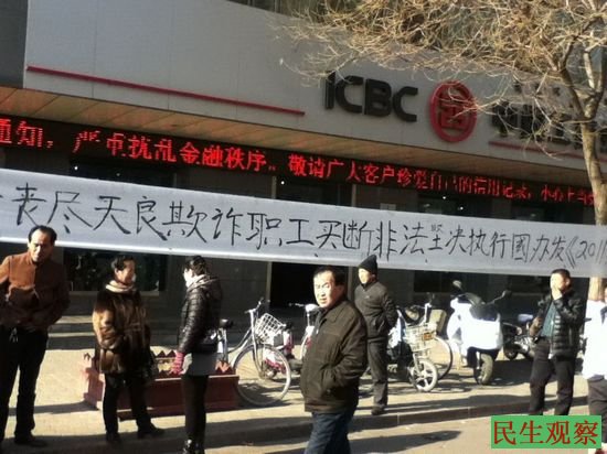 还有,从昨天至今天,内蒙许多的银行买断工龄人士,一直坚持在他们的分行总部拉横幅控诉维权。期间,他们打出了“工商银行丧尽天良,欺诈职工,买断非法…..”的大型横幅进行控诉。