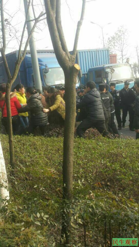 民生观察工作室2015/2/12日消息:今日,重庆市渝北区礼嘉镇康师傅公路上150名农民公拦断公路,向龙湖地产开发公司讨要一年的工资,好回家与家人过年,结果遭到近40名手持盾牌的特警和60名警察和保安的弹压,场面一片混乱,多位农民工被打伤打晕。