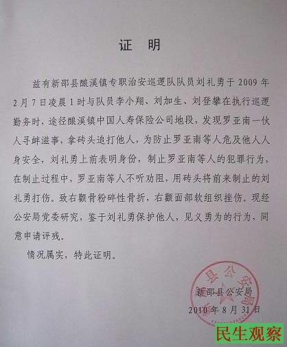 刘礼勇反映,事情源于6年前,当时他是湖南省邵阳市新邵县公安局的一位协警,2009年2月7日凌晨1点左右,他和队友执行巡逻任务时,因阻止罗亚南等人拿砖头追打一个年轻人,罗亚南等人不但没听劝阻,反而公然挑衅拿砖头把他砸伤。后经医院诊断,右颧骨粉碎性骨折,2009年2月10日,酿溪镇派出所委托邵阳市同济司法鉴定所鉴定,鉴定结果构成轻伤。2010年11月8日经邵阳市中兴司法鉴定所和2010年12月28日经邵阳市劳动能力鉴定委员会鉴定,结论都为柒级伤残。