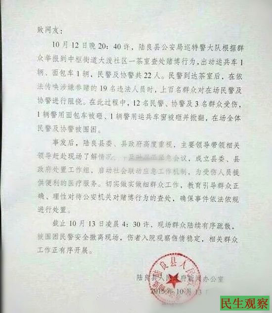 事后,当地政府对外宣称事件系因公安局在查处赌博行为时遭到上百名群众阻挠所引发,对此,村民“_揩脚帕丶”表示:你真是抓赌博的人吗?,你们去到那里直接抓其中一个人,这个人还是大泼树人民代表其中一个,他一个人能赌博起来?