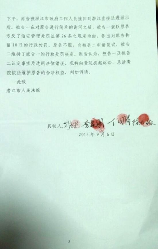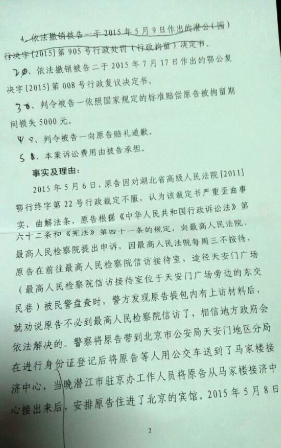 据悉,2015年5月6日,刘应安在北京前往最高检信访接待室递交材料,中途经天安门时被巡逻警察扣留,并把他送到马家楼,当晚被潜江市驻京办截访人员接出,三日后送回潜江市直接丢进派出所,在进行简单的询问后,以刘应安违反治安处罚法第26条规定为由,将他行政拘留10日。刘应安不服此处罚,并向湖北省公安厅申请复议,结果省厅维持了此行政处罚。所以刘应安对省厅和市局同时提起诉讼,希望法院能维护自己的合法权益。