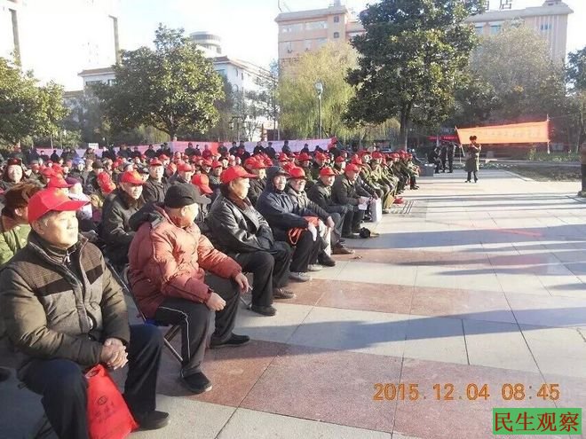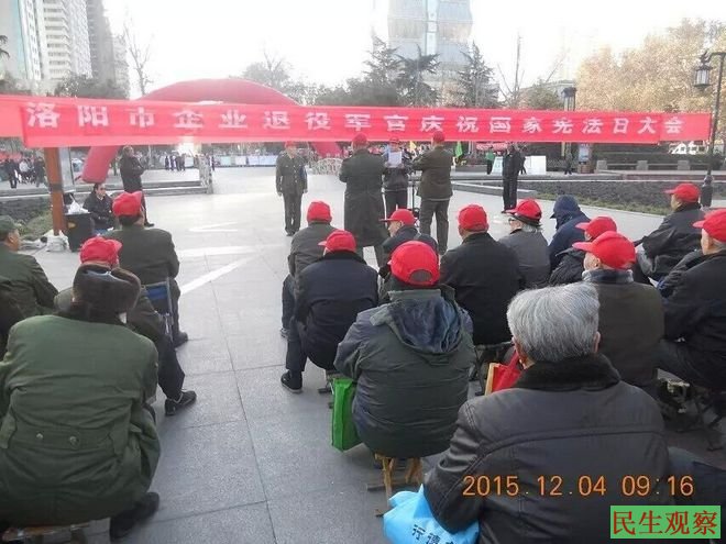 民生观察工作室2015/12/4消息:今天是所谓的“宪法日”, 上午8点30分洛阳市在企业工作的1000多名退役军官从四面八方来到在市中心的周王城广场,老军人们首先打出了庆祝国家宪法日的标语。