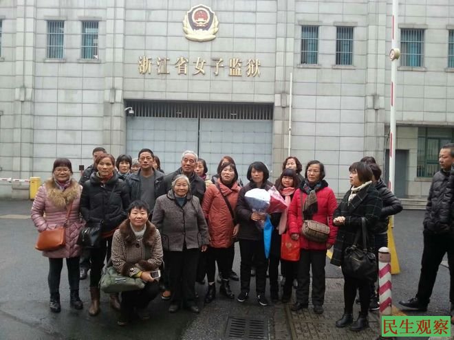 民生观察工作室2015/12/13消息:杭州市萧山区农嫁女、拆迁维权户凤加文(杭州维权人凤加文“寻衅滋事罪”案二次开庭http://www.aaa.aetdhfjgk.cf/a/lanmu49/2015/0119/11731.html)因上访被判刑一年零两个月,今天是她刑满出狱的日子,众多杭州维权上访人前往浙江女子监狱迎接凤加文。