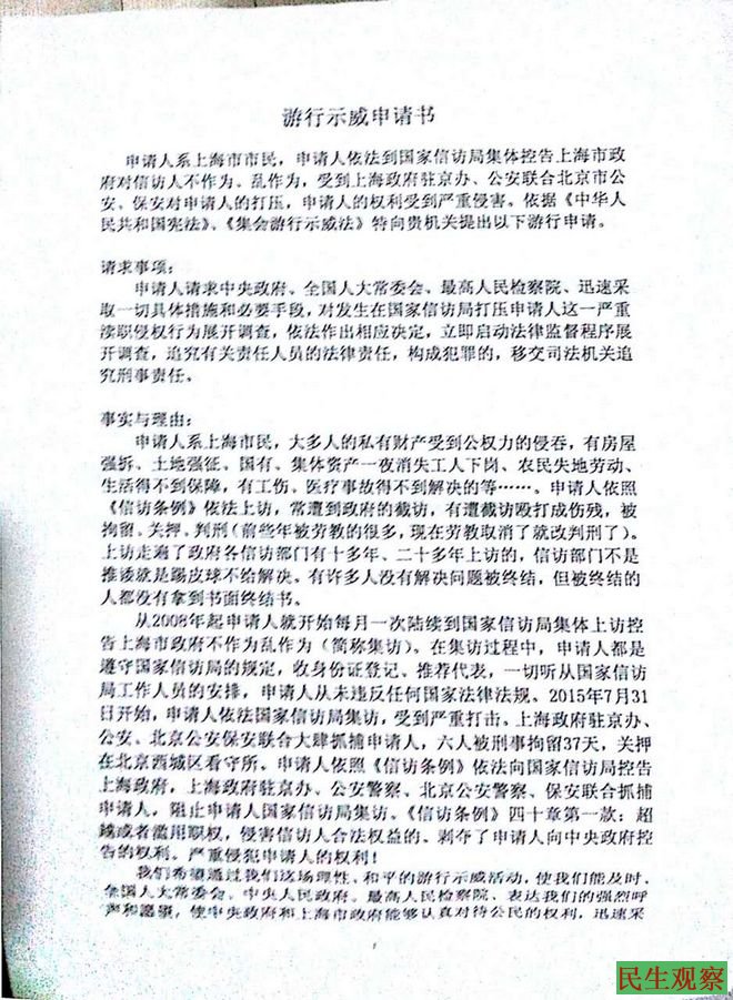 昨天接待警官告知访民,游行申请不被批准。其实大家都很清楚游行申请是不会被批准的。但通过游行申请向全社会发出强音,呼吁全社会共同关注!实现“依法治国”。
