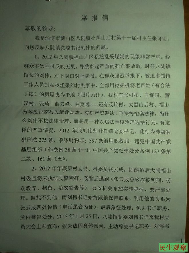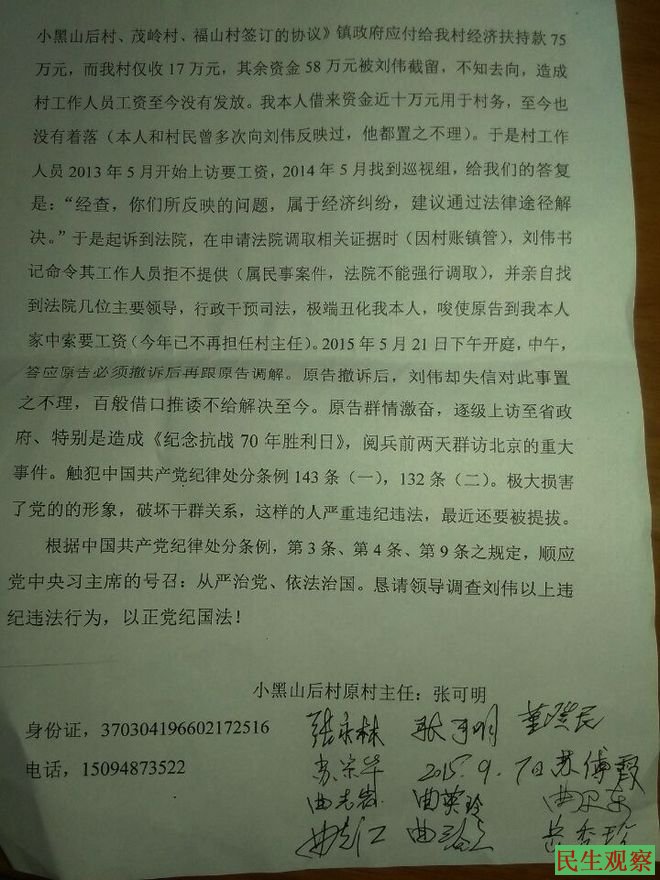 从此,张可明姐弟开始实名举报刘伟滥用职权、非法截留小黑山后村集体款和非法停止他工作等事项,没想到上访又被拘留。