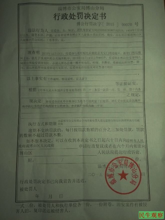 民生观察工作室2016/1/3消息:元旦日,山东淄博市博山区八陡镇张可明到中南海上访,昨天被博山公安分局公安局送到博山区拘留所决定拘留10天。