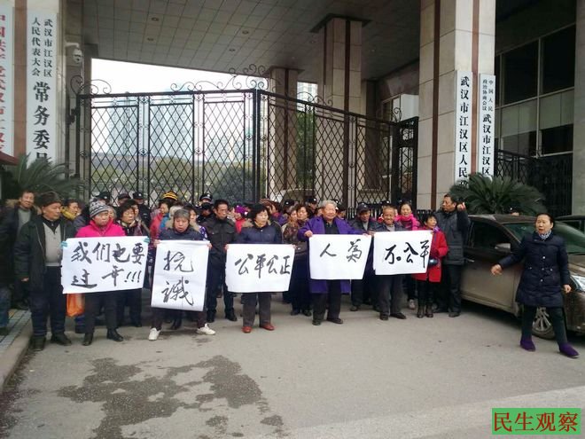 民生观察工作室2016年1月29日消息:今天,武汉市江汉区众多下乡支农返城人员集体来到江汉区政府,再次就他们社保、就业和养老问题请愿。同时,大家还打出 “我们也要过年”等标语诉求。