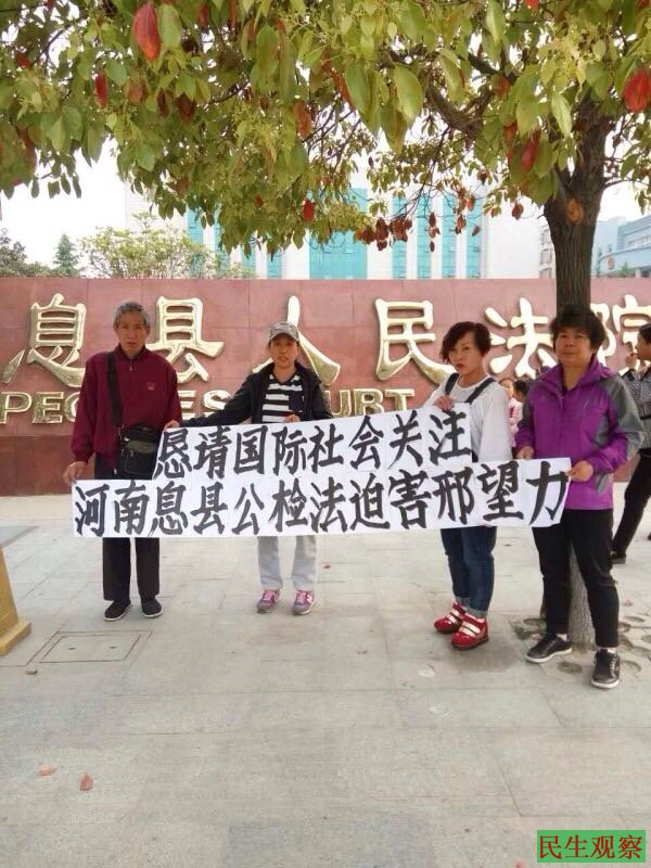 河南省信阳市息县维权人士邢望力为伸张正义做公益,关心他人"命案"而遭当地公安机关报复,被以涉嫌“寻衅滋事罪”抓捕。今日2016年4月12日上午9点于息县法院一楼一庭开庭审判。