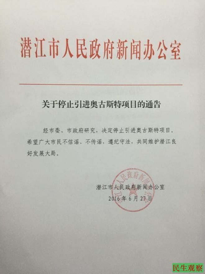 上午11点左右,市政府一位罗姓副市长出面宣布奥古斯特项目停建,同时潜江市政府新闻办公室的一份宣布停建该项目的红头文件开始在市民中散发。