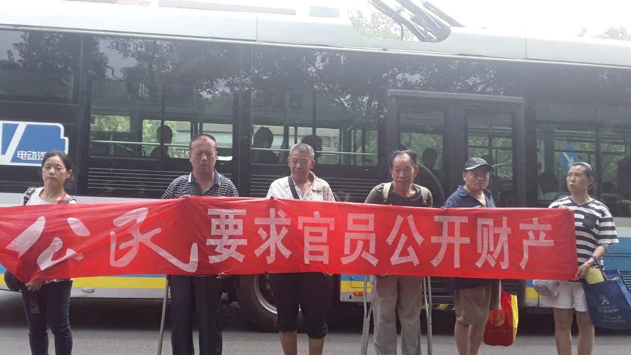 民生观察工作室2016/7/11消息:今天河北张翠磊、杨宗生、甘肃候敏玲、安徽李本才、徐新民、河南刘聚才、江苏吴继新7位在京访民张打条幅寻找在京失联的访民,并要求官员公开财产,停止抢劫民财,不要再制造冤假错案。