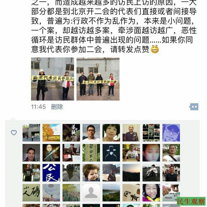 今天早上,正在北京上访的老牌访民广州的李小玲(上访12年)和吉林延边的闫春凤 (上访六年)一起在北京暂住地打出“要求代表访民参加两会” 的牌子(图一),并在微信微博账号上发布(图二),呼吁朋友们支持 ,获得大量点赞和转发 。
