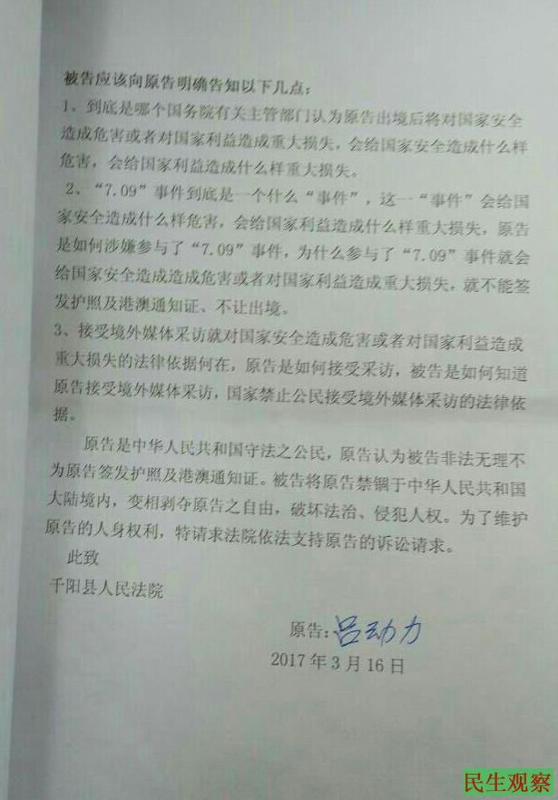 【民生观察工作室2017年3月16日消息】本网获悉,余文生律师已经接受陕西千阳县维权人士吕动力的委托,代理吕动力行政起诉千阳县公安局“不予签发普通护照、港澳通行证”的行政决定。