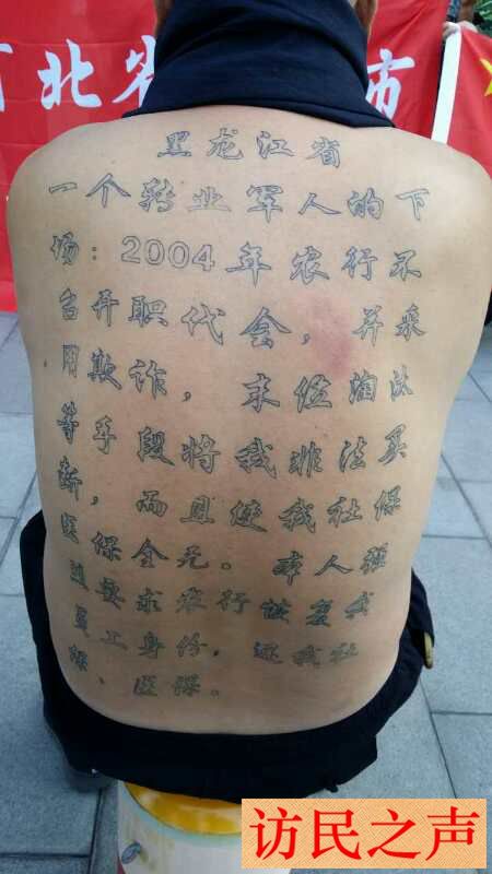 本网发现,现场照片中黑龙江一名失业老兵在背上刺满了字,而这些字竟然是他的诉求及遭遇。还有几张照片中显示,有老兵累的躺倒在久敬庄院内的地上。