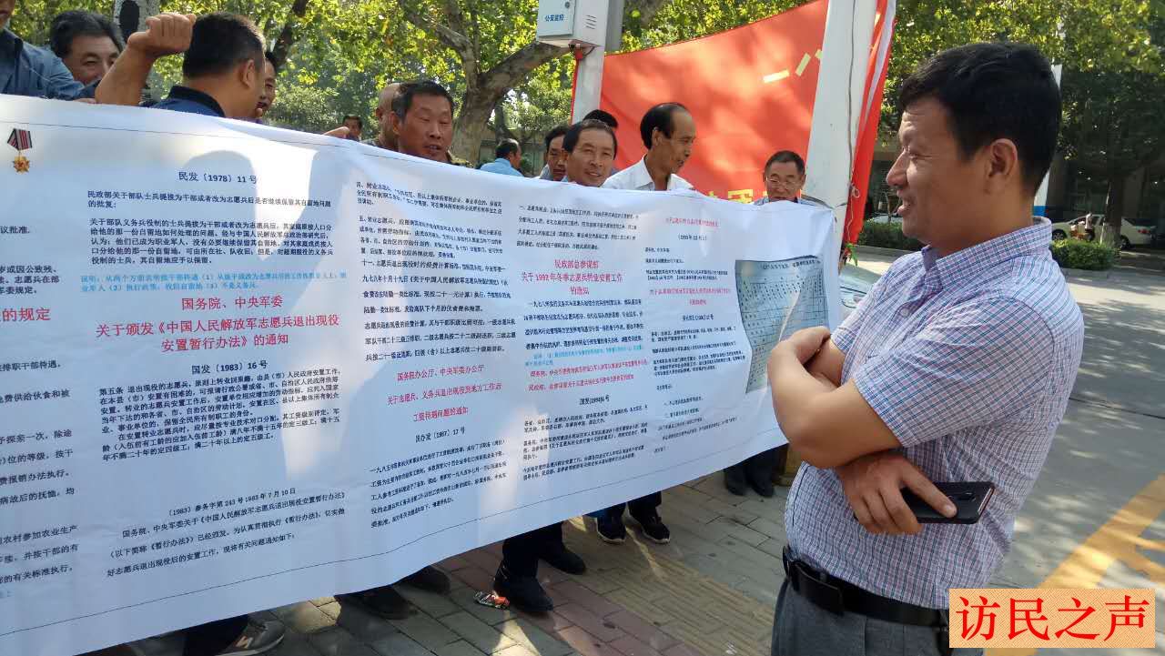 此外,今天,30多名河南濮阳军转志愿兵在市政府维权,要求面见主管市长反映编制被侵吞,优抚待遇无法落实问题,直到下午未获接谈。