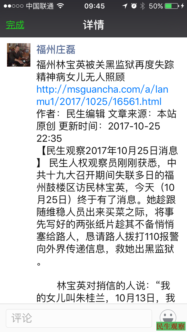 【民生观察2017年10月27日消息】本网在中共十九大期间,所发布的“福建林宝英被关黑监狱再度失踪 精神病女儿无人照顾”这一消息,引起社会广泛关注及网络舆论热议,网友竞相愤慨转发。福州网友庄磊将“民生观察”发布的消息全文转发到朋友圈,随即收到福州市国保大队长来电称“此消息对福州形象影响恶劣”,并要求他“即刻删帖”。