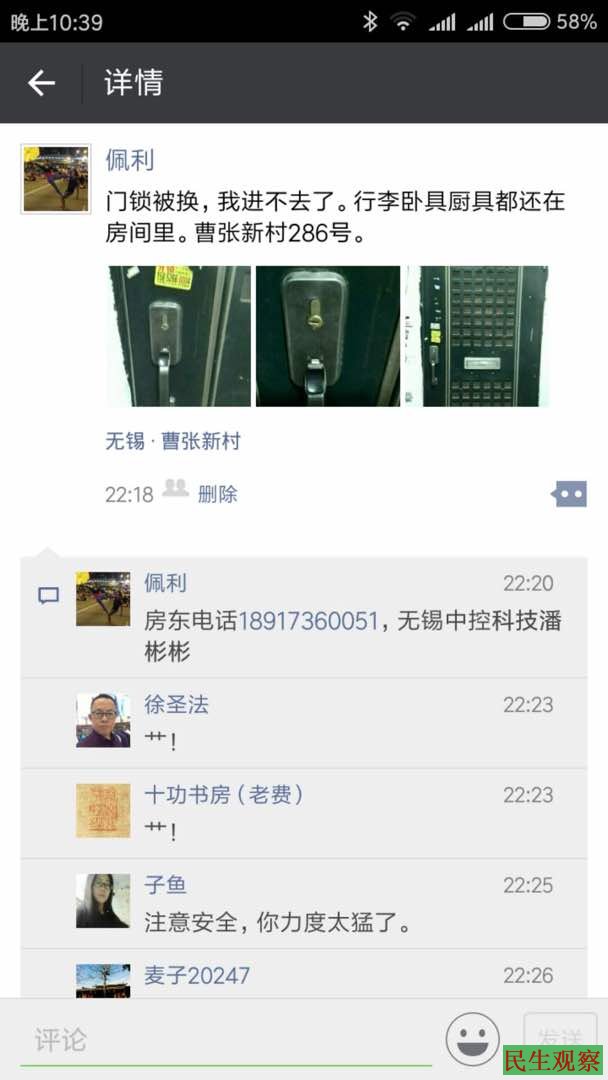 11月21日,现居在无锡曹张新村286号的成都异见人士佩利,被无锡市派出所人员上门登记拍照后,晚上就遭到房东以“要卖房子”为由驱赶,限时三天搬走。由于佩利暂时没有找到合适的房子,并且房东押金并未退还,所以,她的衣物行李仍留在租屋,多次找房东讨要押金要拒绝。