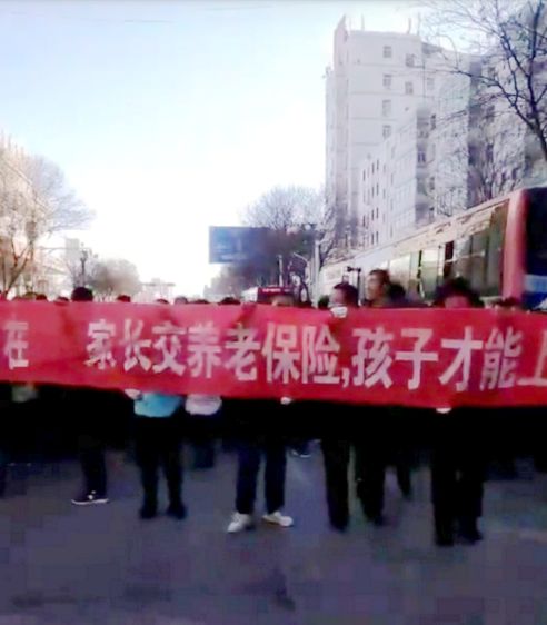 近日,有部分家长开始集体向当地政府反映问题,但当局却将一部分家长抓走关押,此举进一步刺激了很多家长。12月16日、17日两天,数千家长们集体来到市政府和教育局表达自己的愤怒与抗议。据现场视频显示,数以千计的家长拉起条幅,高声质问政府:“凭什么家长交养老保险,孩子才能上学?”