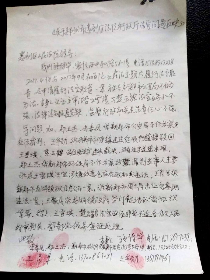 据居民郑王杰反映,2018年1月8日下午4点左右,他和王彦军、施建喜、王和平等七人一同来到了郑州市惠济区法院,准备向该院主管行政工作的史百岭副院长反映以下问题:“2017年4月至2017年9月,郑州居民施得华(音)控告新郑市公安局不作为一案,当事人认为主审法官王雪琪、楚云鹤法律业务水平不强,法律知识极度欠缺,监督行政机关违法、责任心不强等问题。例如,郑王杰、李春凤诉新郑市公安局不作为案存在枉法审判;王华勋诉新郑市某镇违法征收行为被直接驳回,王雪琪、楚云鹤两位法官违法裁决,没有法官的道德水准;郑王杰诉新郑市环保局不作为案中,两法官有故意漏判当事人主要诉求的现象,王雪琪法官还涉嫌故意包庇行政机关违法;王聚成诉龙湖镇政府签订征地补偿协议一案;王彦军诉新郑市龙湖镇政府信息公开一案,诉新郑市国土出让宅基地违法一案中,两法官均不同程度的存在枉法判案的嫌疑;综上,当事人认为,王雪琪、楚云鹤法官已经非常不适合做人民的审判员,希望贵院领导查证处理。”