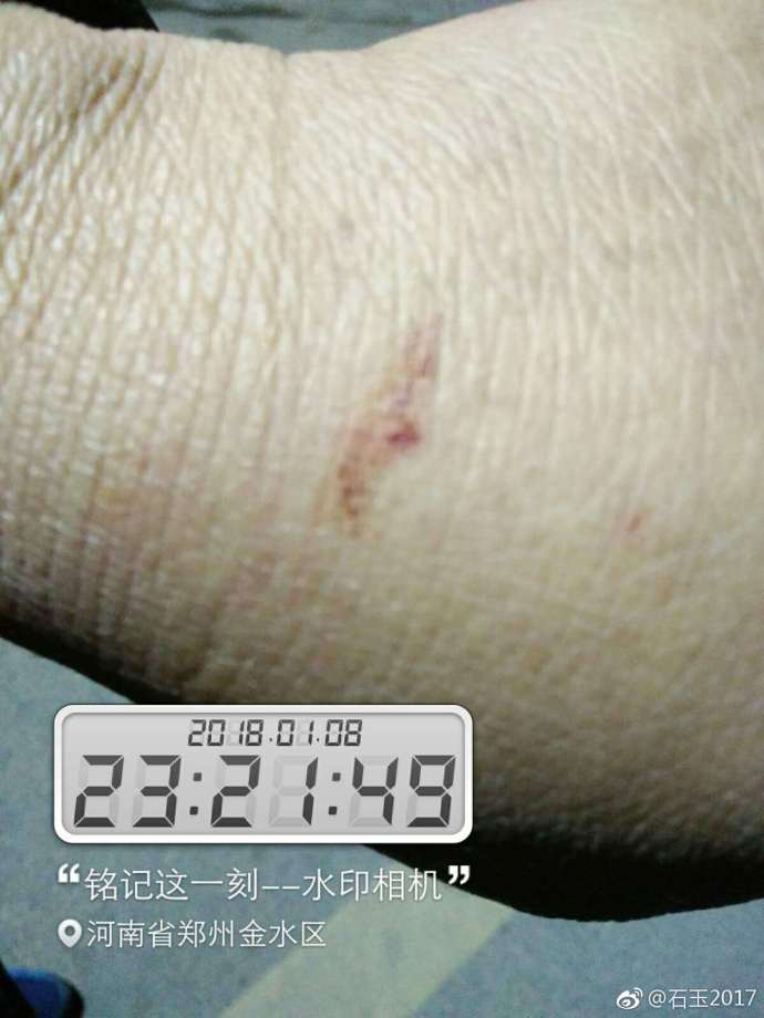 让人意想不到的是,在七位居民在找到史百岭副院长后,他不仅没有听取居民们反映问题,反而叫来法警把他们全部抓走关押。在抓人的过程中,法警十分粗暴,居民郑王杰的左手腕都被手铐铐出的血印。之后,法警又将施建喜处以司法拘留十五日。当天晚十一点半,施建喜被送至郑州市第一拘留所(原金水拘留所)关押。