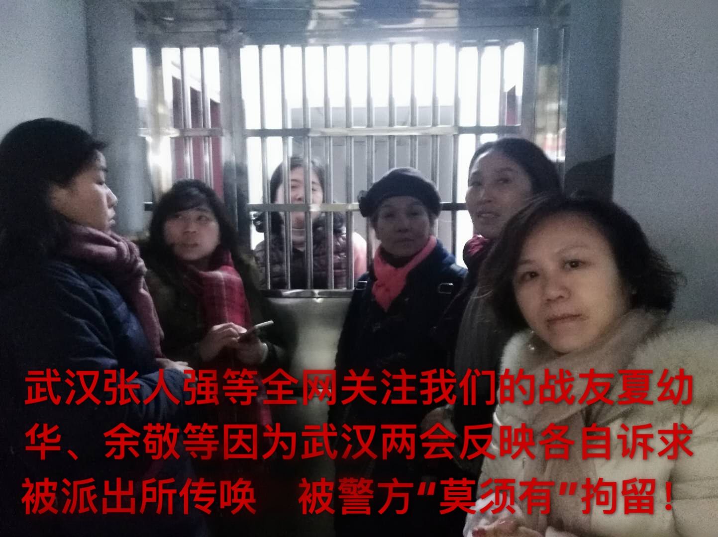 【民生观察2018年1月11日消息】本网获悉,今天上午,湖北武汉访民夏幼华、余敬等人因在武汉市“两会”现场向两会代表反映各自的维权诉求,被武汉市警方行政拘留。