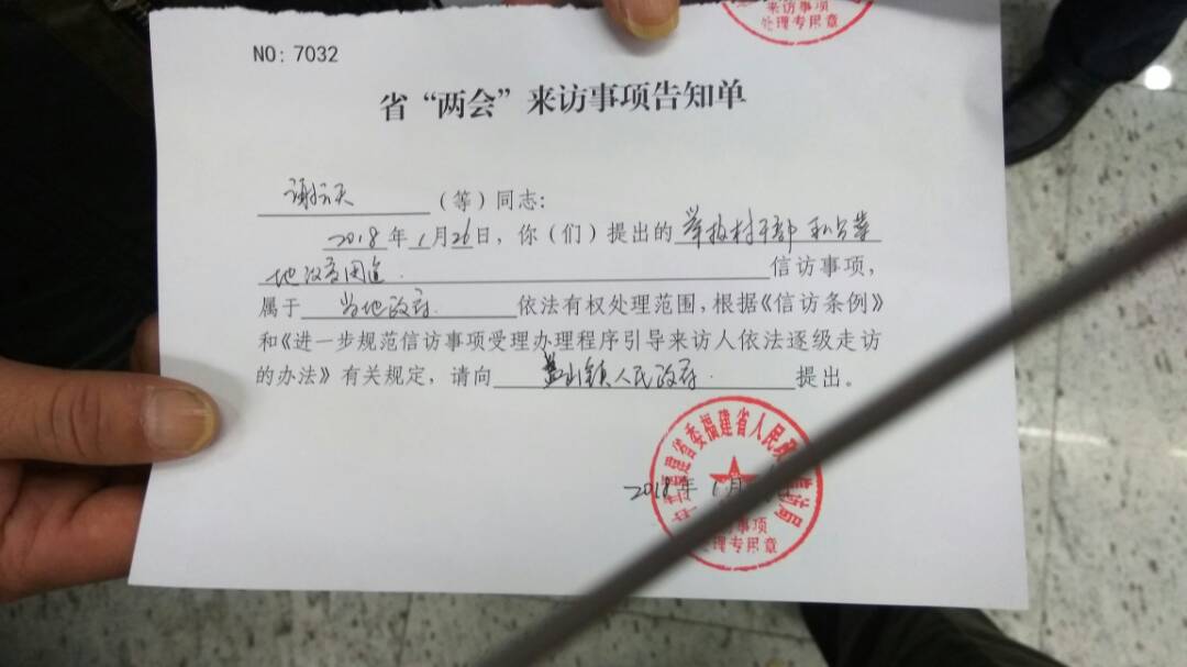据悉,2018年1月25日至31日,福建省十三届人大政协一次会议将在福州西湖宾馆大礼堂召开。报纸等官方媒体透露,今年福建省“两会”代表将在群众接访中心接访。于是,今天(1月26日)早上,福建访民唐兆星和林应强前往福建省十三届人大政协“两会”现场上访,想找代表控告反映福建省仓山监狱扒光抢光入监人员衣物行李物品不还等问题。