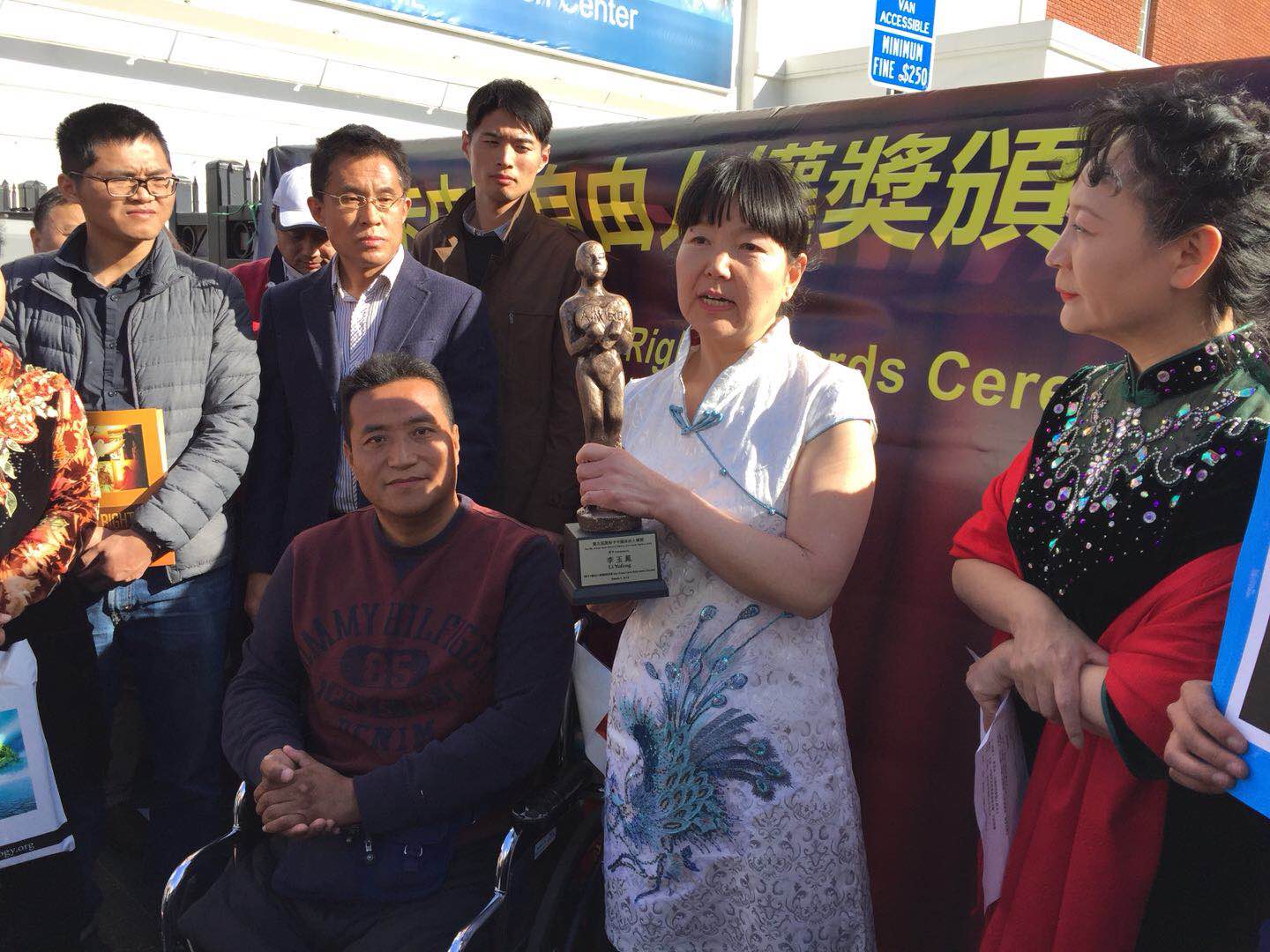 同时,王军涛先生也对李玉凤女士获奖发表了感言,他说:“今天,我很荣幸在这里将本届奥斯卡自由人权金像奖颁发给李玉凤女士。李玉凤女士从自己切身经历中体认到自由和人权的价值,自那时起她全身心投入到在抗击暴政的斗争中维护和彰显自由和人权。她的故事和精神极大地感染和激励国内外为自由和人权而奋斗的同仁。她在暴政残酷迫害中不屈不挠的事迹会是我们时代的中国人的象征性丰碑!”