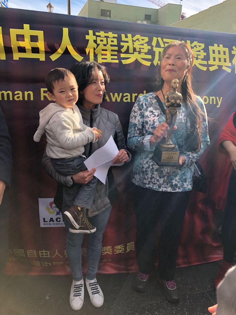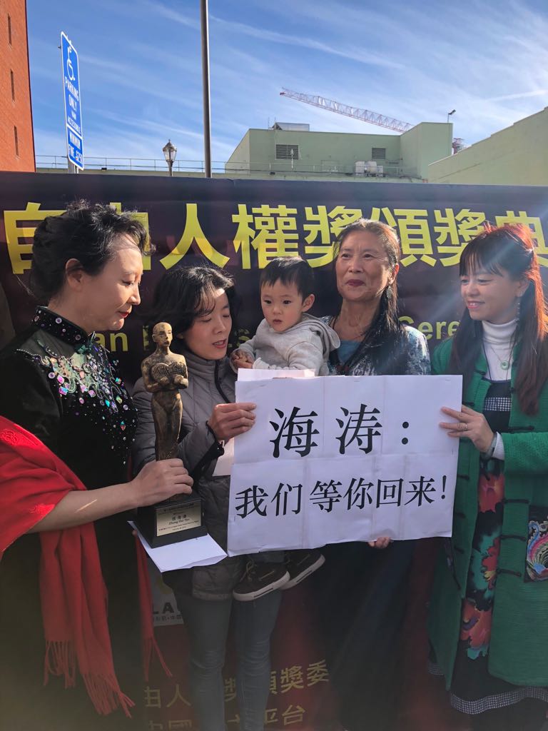 源于给李铁与黄文勋颁奖的汪珉、张林在颁奖后匆匆离去,本网记者没有来得及采访到他们,非常遗憾。值得一提的是,“奥斯卡自由人权奖”第三届获奖者、被当局以“煽动颠覆国家罪、为境外提供情报罪”获刑19年的河南籍在新疆沙雅监狱服刑的中国著名政治犯张海涛太太李爱杰与其子小曼德拉,也应邀来到了颁奖现场。李爱杰成功逃离中国大陆来到美国后,“奥斯卡自由人权奖”组委会成员们给予了李爱杰母子及时的人道关怀,李爱杰表示非常感动与感谢,并在致谢词中说:“奥斯卡自由人权奖颁发给张海涛,这是对张海涛的认可,也是对家属的安慰与鼓励,海涛在一审判决以后,听到了你们颁奖的消息,他感到非常的欣慰。谢谢你们!尽管经历了刑讯逼供和酷刑虐待,被判了19年的张海涛始终没有向中共当局屈服。面对19年的牢狱,他依然能坦然面对。他有坚强的意志与强大的内心来支撑他走完这19年的炼狱之苦。海涛是用鲜血为争取自由而战、是用生命为捍卫人权而战。我作为他的妻子感到荣耀,我会好好地带大我们的孩子小曼德拉,让他在这片自由的土地上茁壮成长。也希望各位朋友继续关注张海涛。我相信,我们总有一天会等到海涛出狱,回到我们身边!”
