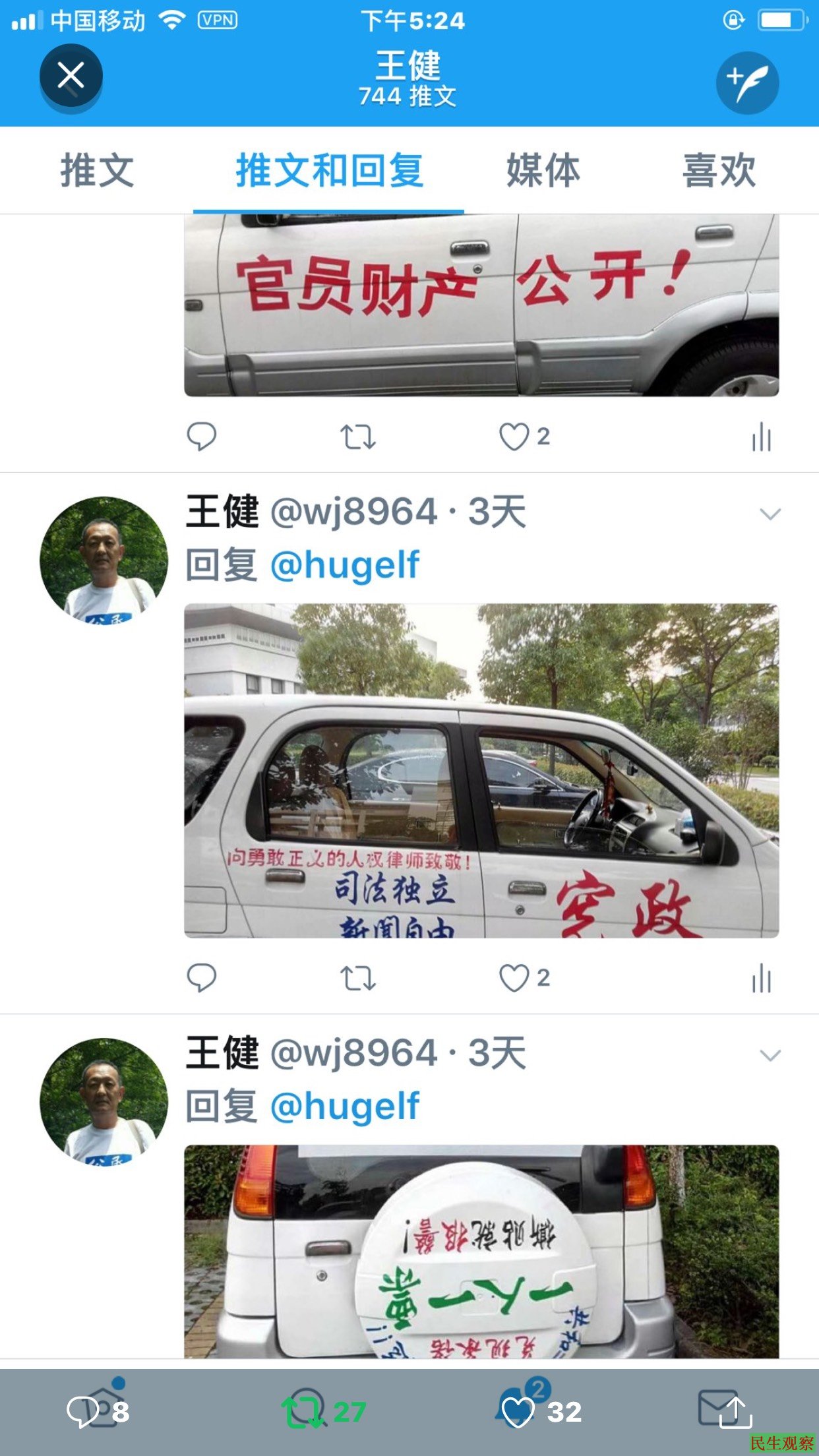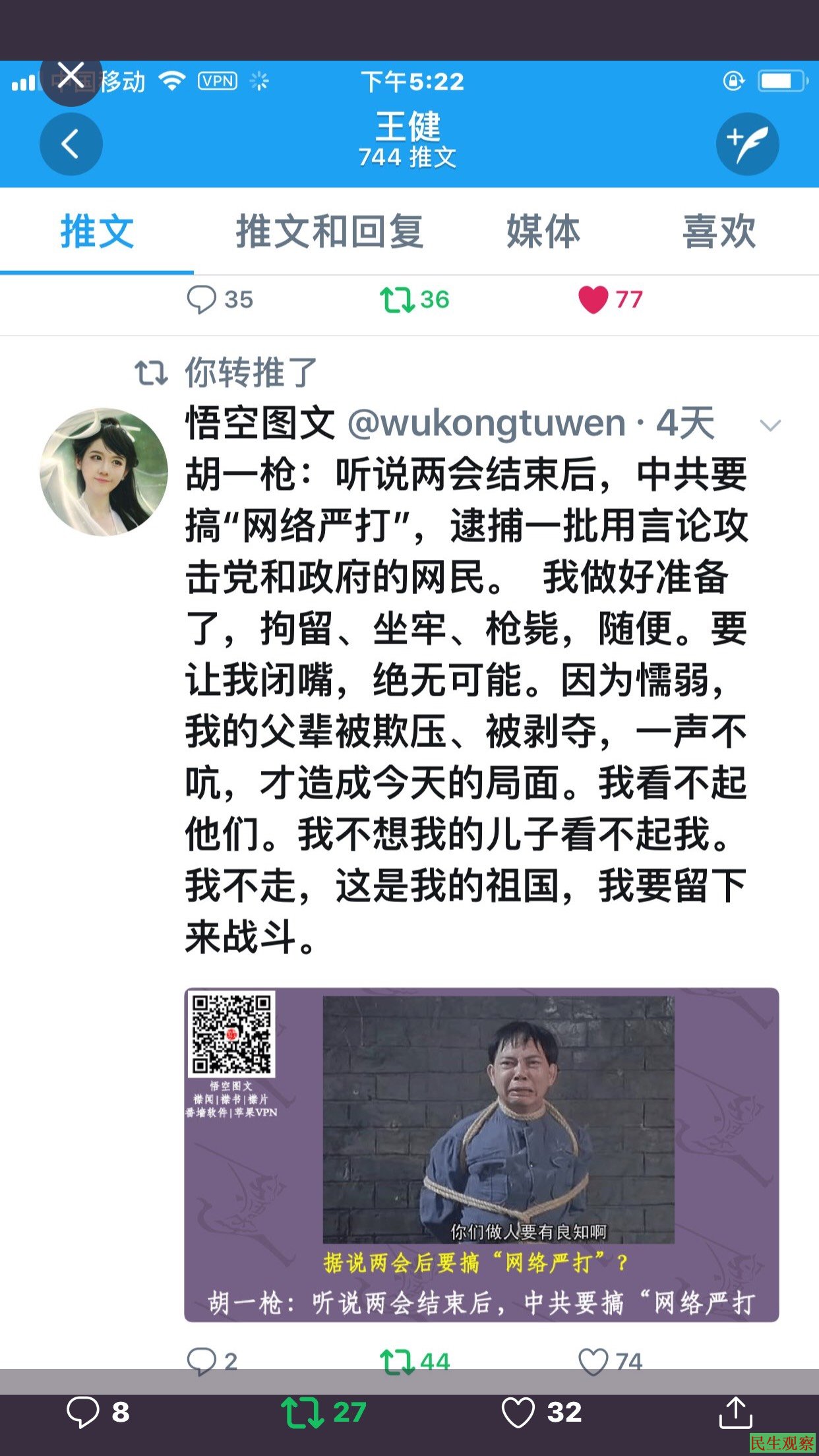 据悉,警方是在今日上午致电王健,要求其前去辖区派出所谈话。中午时王健应约而至,辖区民警出示网监部门提供的推特截图讯问确认。其中一个推文是王健在私家车上张贴的“官员财产公开”、“司法独立”、“新闻自由”、“一人一票”、“宪政”等字样的图片(图一);另外一个推文是王健转发别人的推文,有关“两会”后当局会收紧网络言论进行“网络严打”的内容(图二)。警员以“内容敏感”为由要求其做笔录,“交代”所作所为。