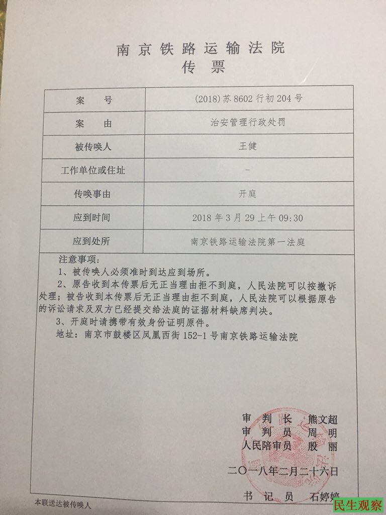 【民生观察2018年3月30日消息】昨日(3月29日)上午九点半,南京维权人士王健不服江宁公安分局行政处罚及南京市政府行政复议案在南京铁路运输法院公开开庭审理。事件起因是王健于去年中共十九大会议前自主拍摄视频宣扬《宪法》条款并上传至网络平台而遭到南京市公安局江宁分局的行政拘留十五天,其后王健向相关部门申请信息公开不果,遂向法院提起诉讼,将相关部门推上被告席。