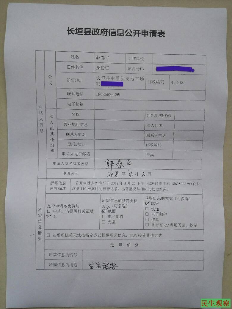 继上次报警一周后的今天(4月2日)中午,河南维权人士郭春平就上个月(3月27日)被长垣县国保队长陈雪、牛姓教导员无端殴打,报案后常村派出所王警官不依法给报案人“案件受理回执”的事情,向长垣县公安局快递邮寄了两份信息公开表。随后,郭春平再次拨打电话联系长垣县110,反映3月27日被国保殴打的遭遇及索要“案件受理回执”。110警察说他们只管当天的报警,受理回执还得找常村派出所。