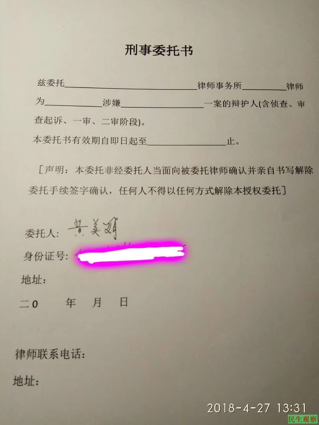而在今年4月下旬,黄美娟曾预感到自己可能被抓,所以提前留下了律师委托书。通过其微信朋友圈我们了解到,4月24日她曾给朋友留言:“鉴于前期叶启明突然失联,然后通过寻找发现被九江警方刑拘。目前诸多同城朋友或网友,都想给他提供律师及各种帮助,但因其自己本人没有给其它律师留下授权委托书,而且其家人也不愿意出示委托书,亦不肯接受网友们的帮助,以致律师、网友不能了解所涉案情,也不知其在看守所内的情况和其内心的想法和安排。鉴于近期对异议者打压有愈演愈烈之势,前天国保及社区街道一行六人来我家谈话,还带了执法记录仪对谈话全程记录,而以前国保到我家找我谈话是不带执法记录仪的,我也感到山雨欲来风满楼,恐怖的脚步声离我越来越近。为避免我自己遇到这类不期而至的锁链措手不及,因家人不支持而见不到律师的被动情况,所以先把律师委托书写好留给律师。”