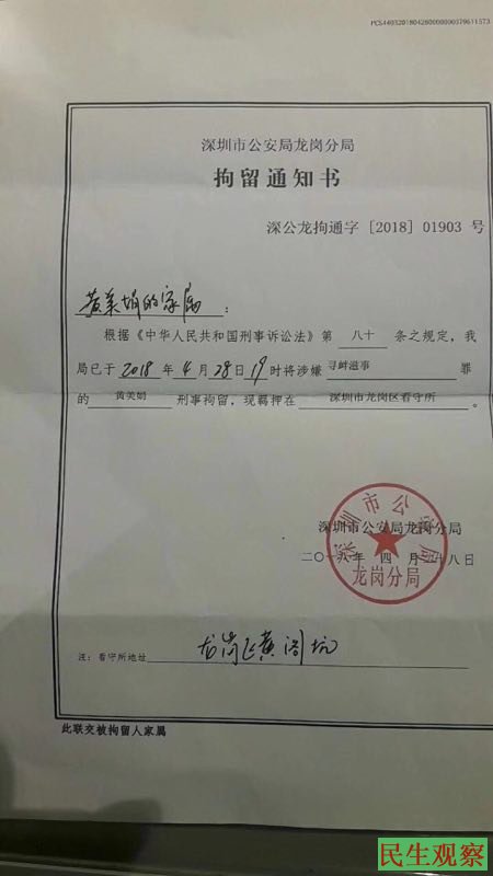 【民生观察2018年6月4日消息】本网获悉,深圳维权人士黄美娟,于今年4月28日被深圳公安局龙岗分局以涉嫌“寻衅滋事罪”刑拘,在被非法关押30多天后,目前获取保候审。