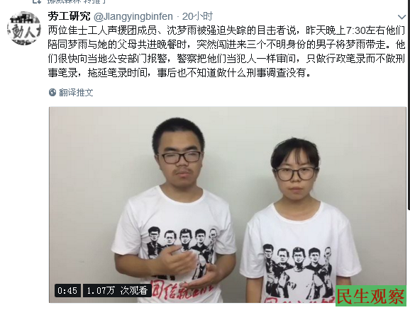 【民生观察2018年8月13日消息】本网获悉,佳士声援团成员沈梦雨于8月11日晚被不明身份人员绑架,现已失联,下落不明。而佳士声援团成员连日来被坪山警方密切监控,但誓言会继续声援佳士工友,直到被捕工人全部获释为止。