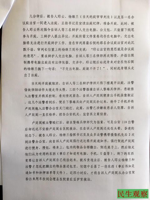 律师表示,法官邱云的言行违法,要予以控告。法警随即推搡律师。卢廷阁律师准备拍摄法警行为,被法警拖入办公室殴打。至当日中午12点30分,卢律师被送医查伤。