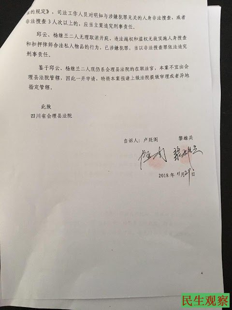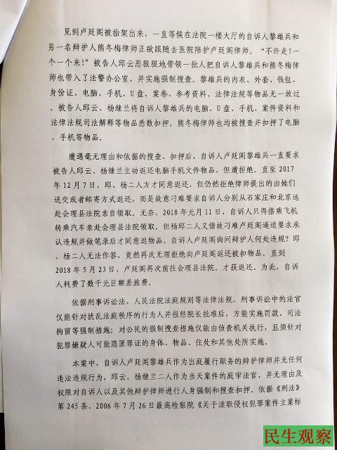 目睹卢律师的遭遇,熊冬梅、黎雄兵两位律师提出抗议,要求制止法警的粗暴违法行为。法官邱云威胁道:“你们等著!一个一个来……”