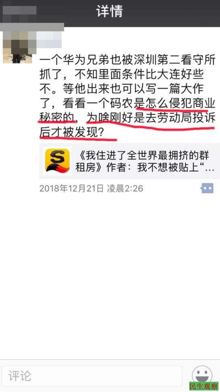 据悉,早前有两名曾服务华为多年的员工因年龄问题(超过三十四岁)遭到公司非法裁员,其后六十几名同样遭遇的前员工组建微信群,并向深圳市劳动仲裁部门进行投诉,未见任何效果却引来抓捕,在失踪多时后才得知拘捕情况,警方以“侵害商业机密”的罪名进行刑事拘留。而其中一名张姓被捕前员工疑似在群中讨论华为偷漏员工薪资税项问题而随后被捕。