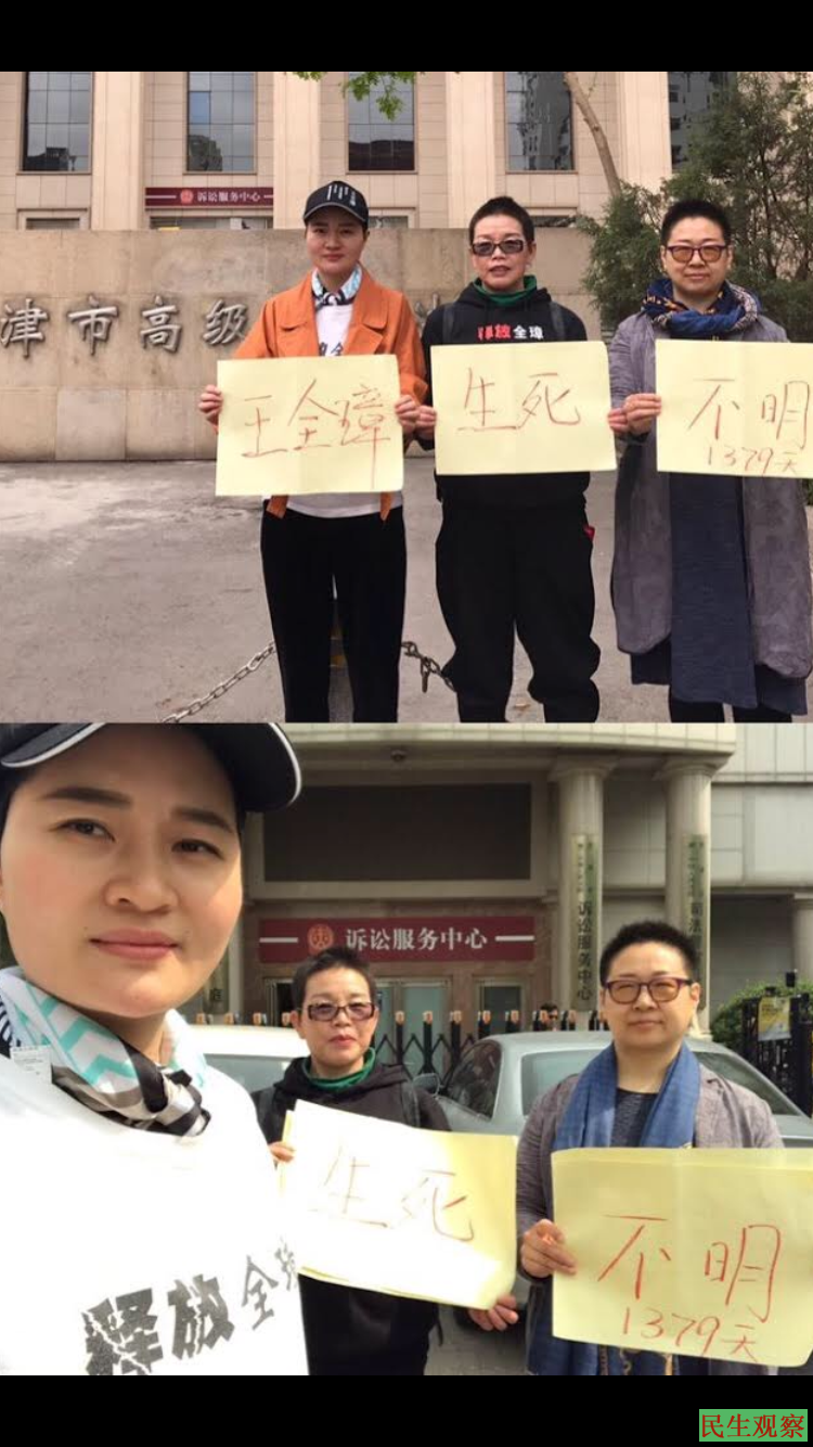 继家属3月11日向天津第二中级法院主审法官索要判决书无果后,今日(4月19日周五)上午,王全璋妻子李文足在同为“709案”家属的王峭岭和刘二敏陪同下,再次从北京赶到天津,除了向天津高级法院查询王全璋案件上诉的相关情况之外,亦再次向天津市二中院索要王案的判决书。