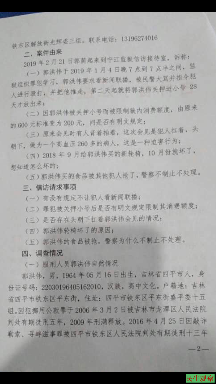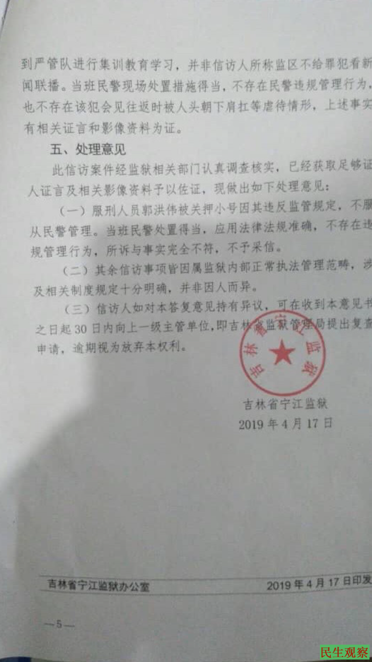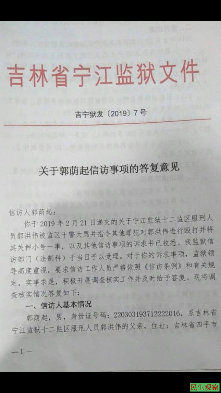 人权观察员认为:通过监狱给的答复意见书看到吉林四平宁江监狱一再维护自己的错误行为,官官相护,为非作歹欺压百姓,监狱任意殴打在押人员,随意使用虐待酷刑,严重侵犯人权,请吉林省政府关注宁江监狱服刑人员郭宏洪伟的人生安全,也请世界各界媒体关注郭洪伟被殴打一事,关注郭洪伟人权被侵犯一事。