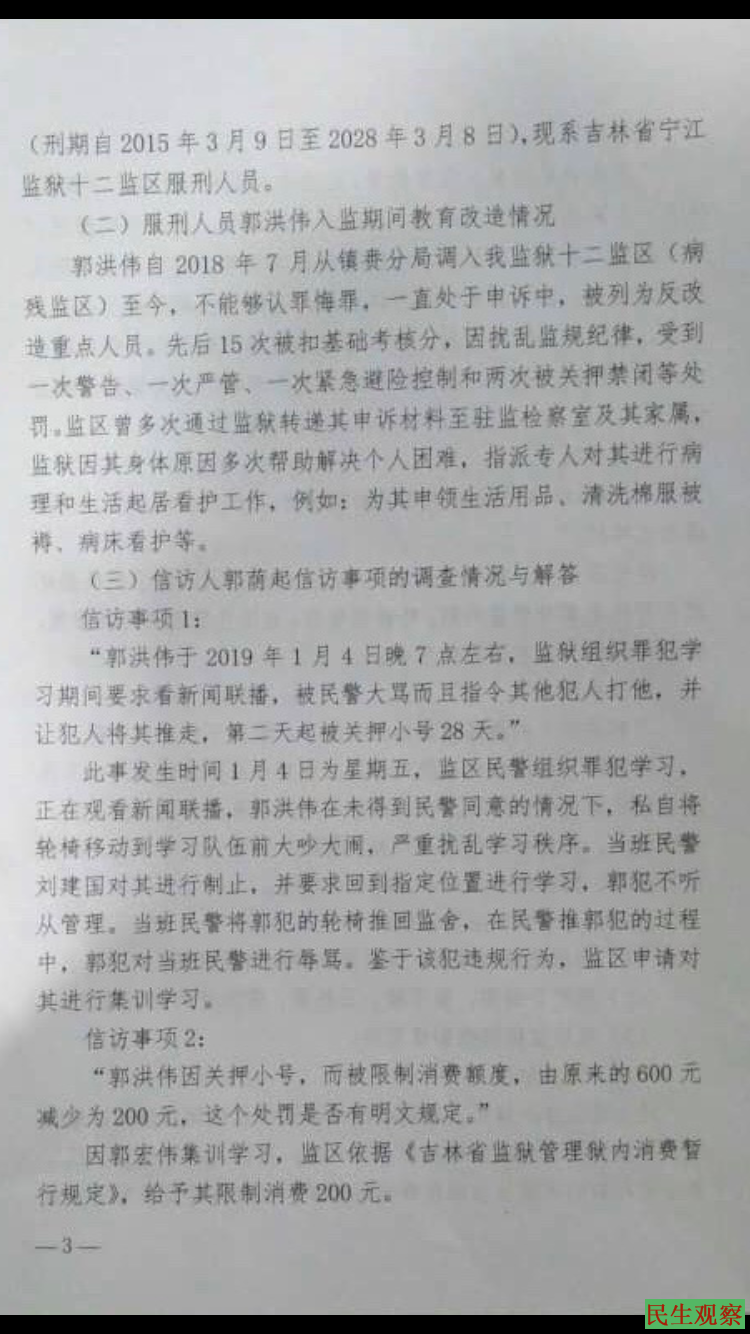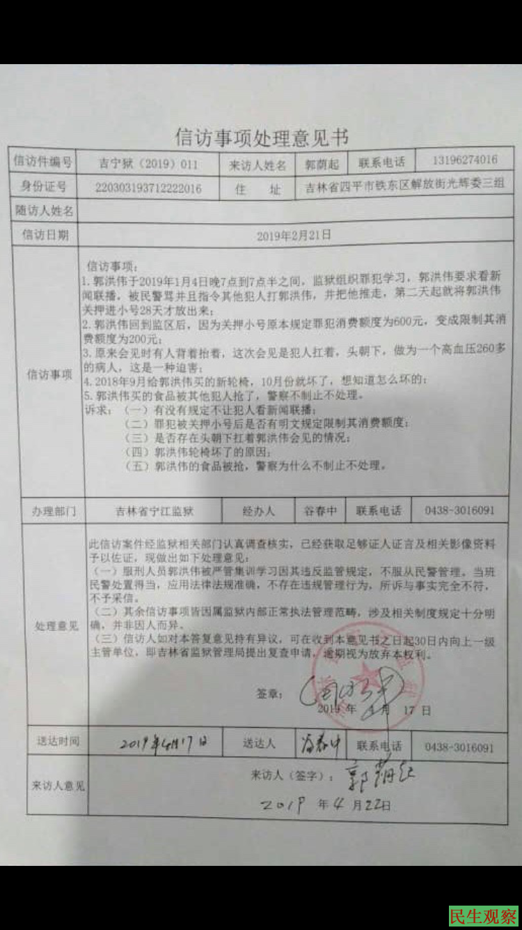 这些情况在2月17日探监后,于2月21日向宁江监狱信访反映。3月4日宁江监狱出具受理告知书。声称60天内会给予书面答复。然而3月10日再次去探监时,发现郭洪伟仍旧是被犯人扛着离开的。并且在聊天中得知,原本监狱规定的一个月可以给家里打一次电话,但是从这个月开始郭洪伟不准打电话了。