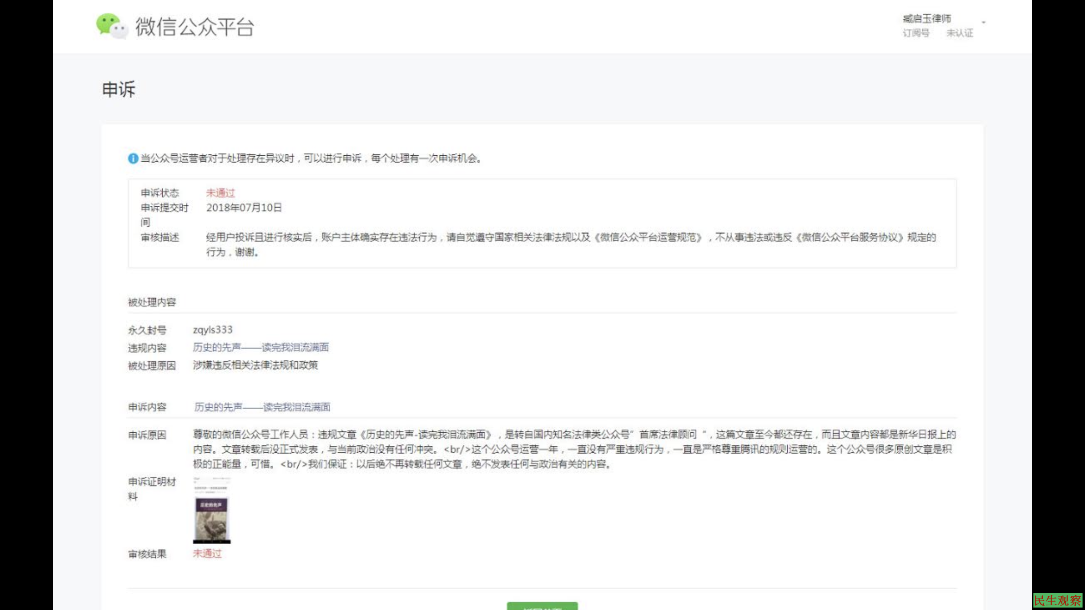 2018年7月10日,腾讯科技(深圳)有限公司以我们公众号的一篇文章《历史的先声——读完我泪流满面》“经用户投诉并经平台审核确认,涉嫌违反相关法律法规,已被永久封号”为由,将微信公众号“臧启玉律师(ID:zqyls333)”永远封禁。