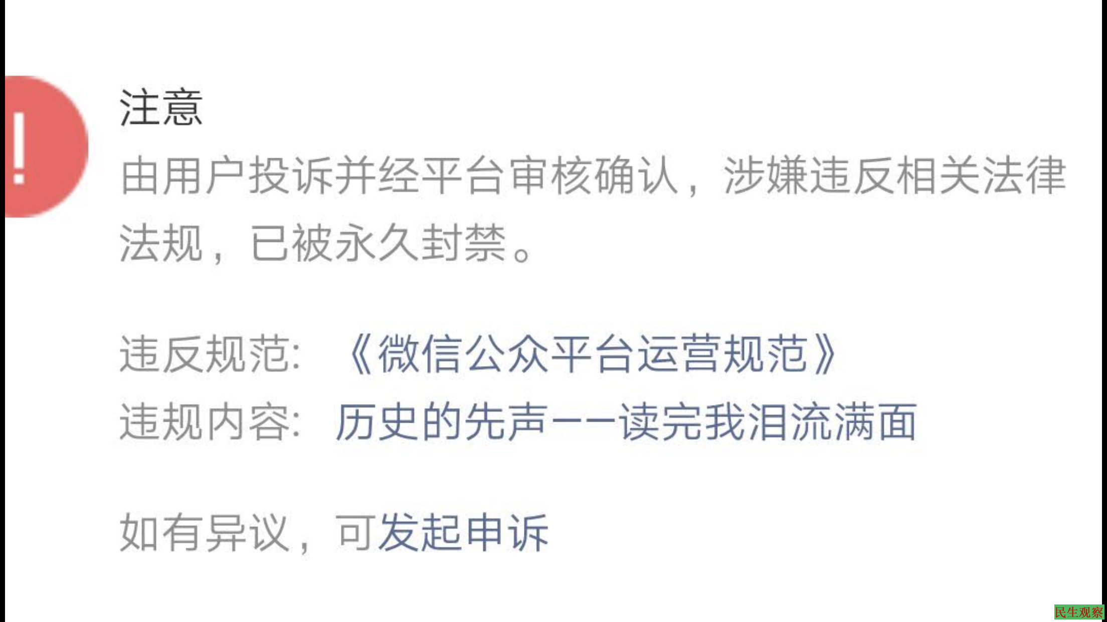 2、文章《历史的先声—读完我泪流满面》目前这篇文章是来源于我国权威媒体《新华日报》,至今在其它微信公众号上依然长期存在而且阅读量较大。单独对“臧启玉律师”公众号永久封禁不合理。